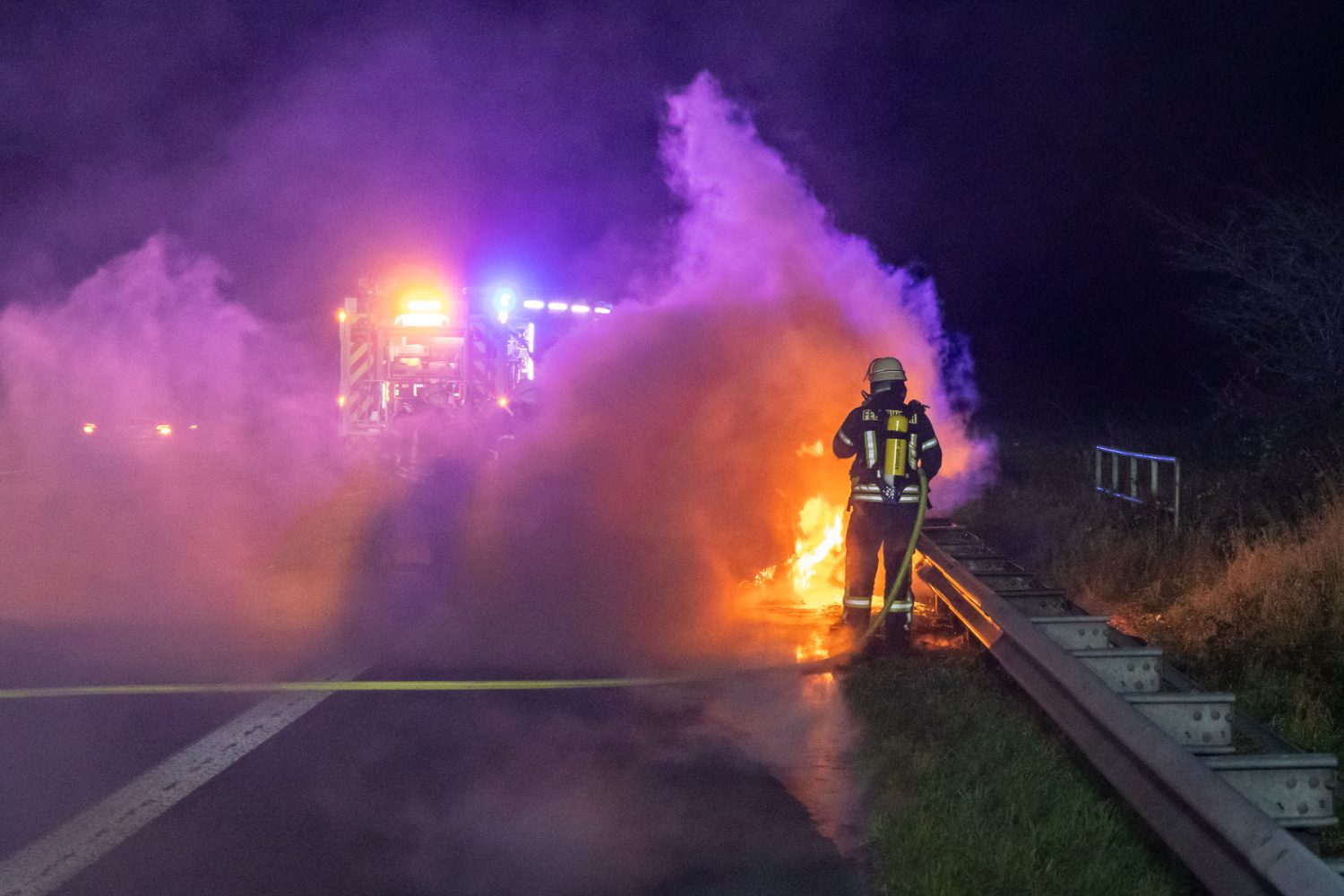 Porta Westfalica A2. Die Freiwillige Feuerwehr Porta Westfalica wurde am Dienstag, 23.12.2025, gegen 00:53 Uhr zu einem PKW-Brand auf der A2 alarmiert. Bei Eintreffen stand das Fahrzeug in Vollbrand, die Insassen – 2 Erwachsene und ein Kind – hatten das Fahrzeug aus eigener Kraft verlassen können und waren unverletzt.