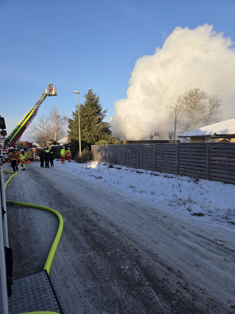 Die Feuerwehr Minden wurde am heutigen Sonntag Vormittag um ca. 10.00Uhr zunächst zu einem Wohnungsbrand alarmiert. Einsatzort war der Ziegeleiweg. Bei Eintreffen der Feuerwehr stand das Erdgeschoss eines Einfamilienhauses in Vollbrand. Eine Person wurde als vermisst gemeldet. Sofort wurde ein umfassender Löschangriff mit mehreren Trupps sowohl von Außen als auch von Innen eingeleitet. Da sich das Feuer in den Dachstuhl ausgebreitet hatte, kam unterstützend die Drehleiter zum Einsatz. Nach ca. vier Stunden war das Feuer unter Kontrolle. Die Einheit Hahlen übernahm eine Brandwache vor Ort. Im Rahmen der Maßnahmen wurde eine Person im Gebäude aufgefunden. Der Notarzt konnte nur noch den Tod feststellen. Eine Einsatzkraft musste aufgrund von Kreislaufproblemen durch den Rettungsdienst untersucht werden, musste aber nicht ins Krankenhaus transportiert werden. Das Gebäude hat durch das Feuer erheblichen Schaden genommen. Die Einsatzstelle wurde durch die Polizei beschlagnahmt. Zudem hat sie die Ermittlungen zur Brandursache aufgenommen. Im Einsatz waren die Berufsfeuerwehr, sowie die freiwilligen Einheiten Bölhorst/Häverstädt, Dützen, Haddenhausen, Stadtmitte und Hahlen sowie die Sondergruppen Versorgung, Logistik, Atemschutz und Einsatzleitwagen. Hinzu kommen das Team psychosoziale Unterstützung sowie die Notfallseelsorge. Der Rettungsdienst der Feuerwehr Minden war mit einem Notarzteinsatzfahrzeug und zwei Rettungswagen vor Ort. Die städtischen Betriebe Minden unterstützten mit einem Streufahrzeug an der Einsatzstelle.