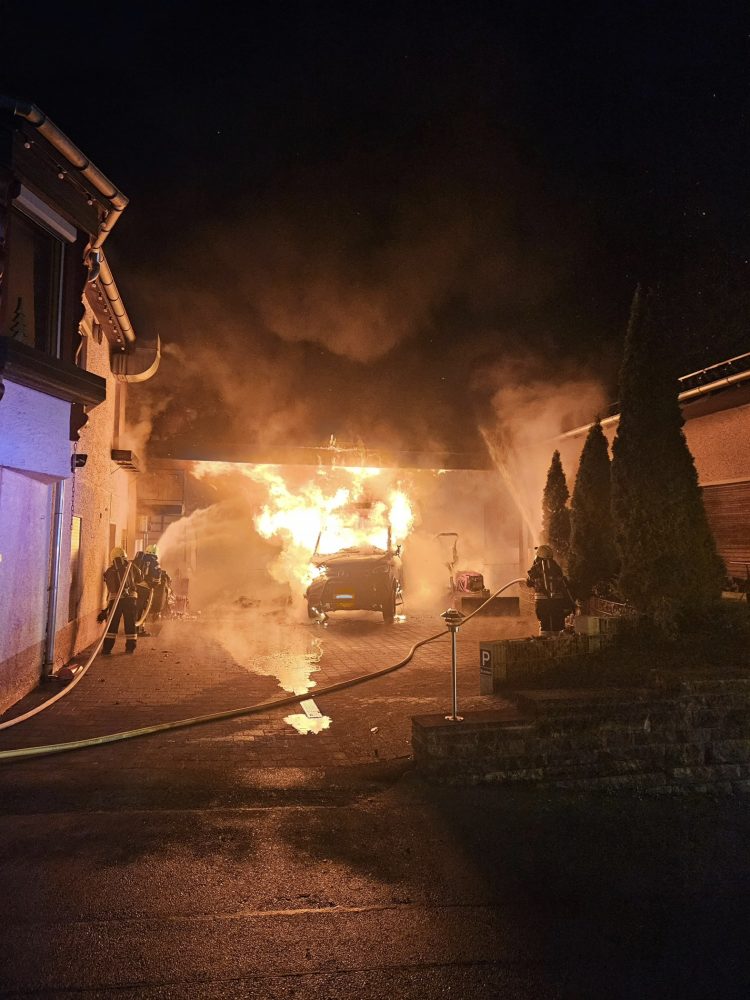 Ein großer Feuerschein war in der Olgastraße in Nagold sichtbar als am Sonntagmorgen gegen 7:00 Uhr die Feuerwehr alarmiert wurde und kurz danach an der Einsatzstelle eintraf. Bewohner und Anwohner alarmierten die Feuerwehr, da zwischen einem Wohnhaus und einer Gasstätte ein Brand in einem Carportbereich ausgebrochen war. Beim Eintreffen der ersten Einsatzkräfte wurde dem Einsatzleiter und stellv. Kommandant der Feuerwehr Nagold Philipp Katz mitgeteilt, dass sich alle Personen aus den beiden Häusern unverletzt in Sicherheit bringen konnten. Somit wurde umgehend mit der Brandbekämpfung begonnen.