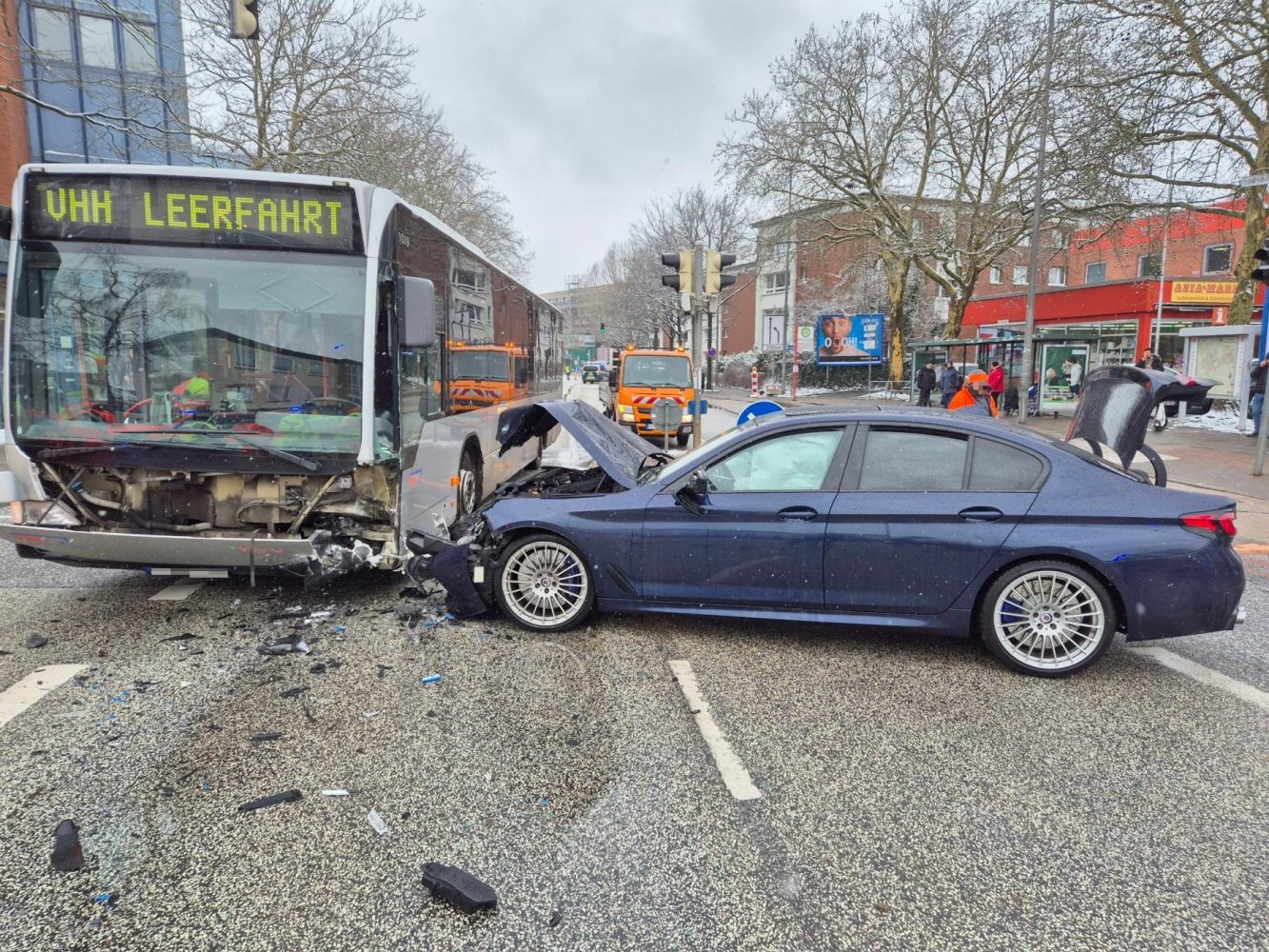 Die 61-jährige Busfahrerin und drei Fahrgäste wurden bei dem Verkehrsunfall leicht verletzt. Der BMW-Fahrer und zwei Mitfahrer verletzten sich ebenfalls leicht. Alle Verletzten mussten vorsorglich in Krankenhäuser verbracht werden.