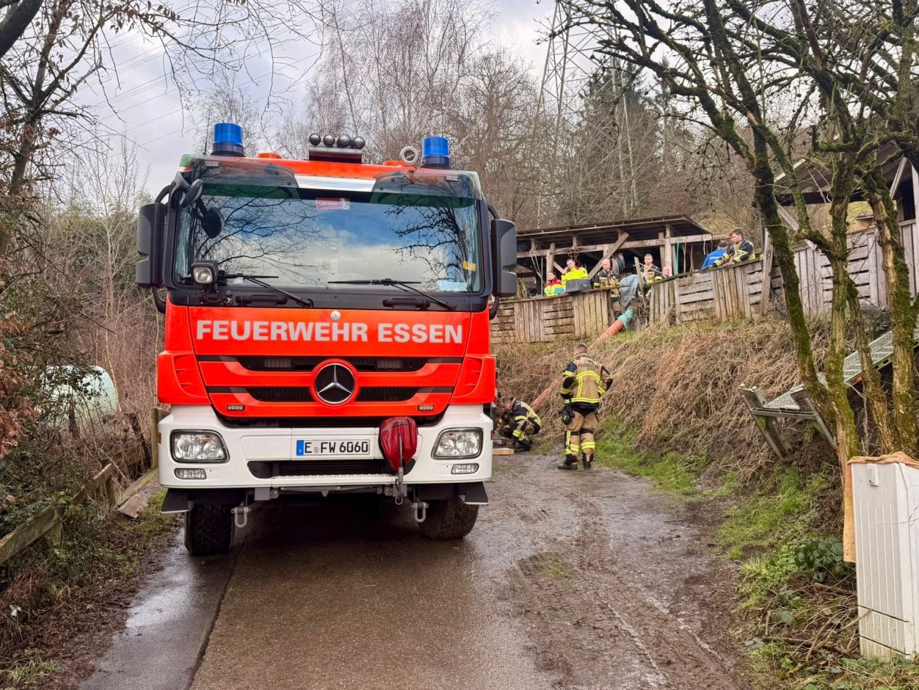 Am Montagvormittag, 16. Februar 2026, wurde die Feuerwehr Essen um 11:40 Uhr zu einem Tierrettungseinsatz an die Singscheider Höhe im Stadtteil Kupferdreh alarmiert. Auf dem Gelände einer Pferdepension war ein Pferd auf einer schlammigen Wiese ausgerutscht und konnte aus eigener Kraft nicht mehr aufstehen.